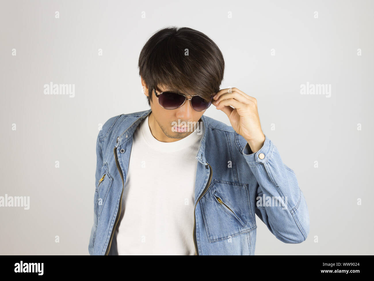 Young Asian Man In Jeans Jacket Or Denim Jacket Wear Sunglasses