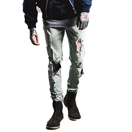 Gersri Vintage Men Jeans Hole Pants Light Blue Skinny Jeans Male