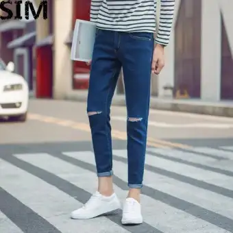 Sim Skinny Jeans Ripped Knee Broken Denim Pants Korean Fashion Men