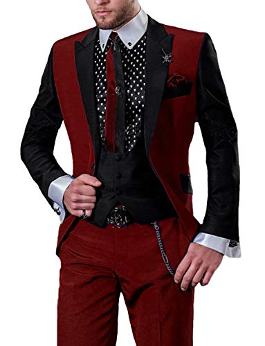 3pcs Men Suits Set Male Dress Fashion Jacket Pant Vest Burgundy