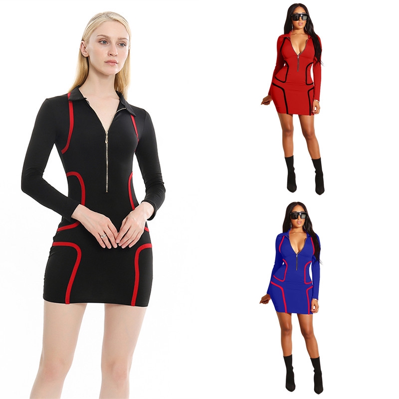 Zipper Stand Collar V Neck Long Sleeve Bodycon Dress Women Fashion