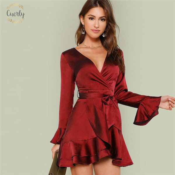 Burgundy Party Dresses Solid Split Back Ruffle Trim Overlap Front