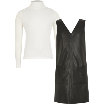 Girls Black Faux Leather Shift Dress Outfit River Island