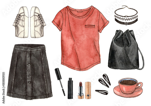 Watercolor Hand Drawing Sketch Fashion Outfit A Set Of Clothes