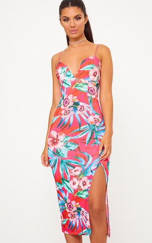 Hot Pink Tropical Floral Print Midi Dress Dresses Prettylittlething
