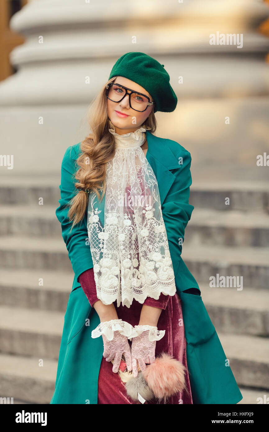 Fashion Portrait Of College Student Girl At Campus Outdoors Stock