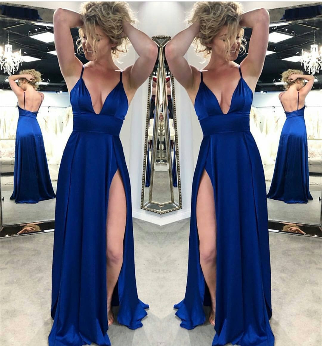 Navy Blue Deep V Neck Long Prom Dress Dark Blue Evening Dresses