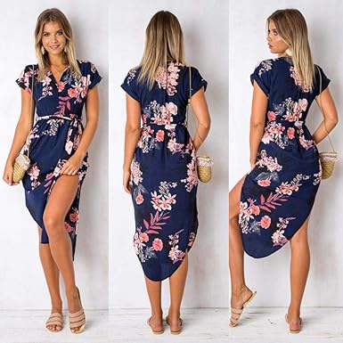 Ailler Women Summer Casual Short Sleeve V Neck Floral Slim Dress