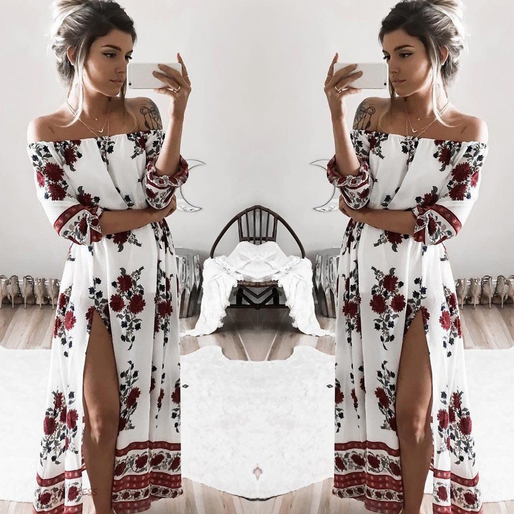 Sexy Split Boho Flroal Print Off Shoulder Dress Women Elegant