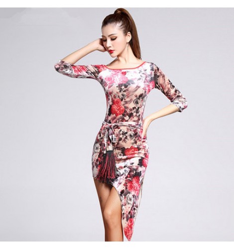 Pink Rose Floral Printed Velvet Middle Long Sleeves Side Split