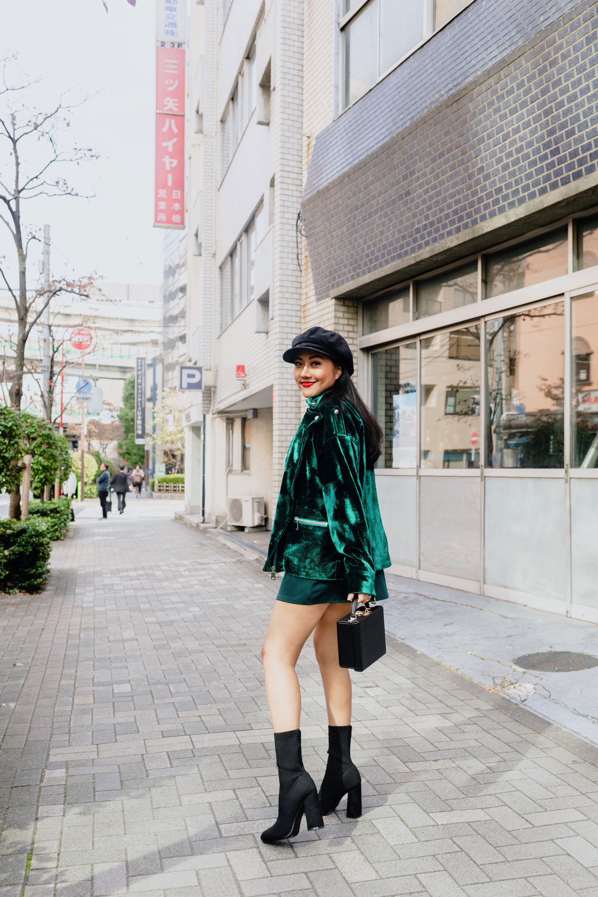 Leather Jacket And Velvet Dress For An Easy Holiday Outfit