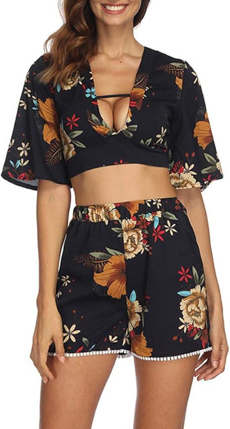 Amazon Com Women Two Piece Outfits Set Boho Deep V Neck Open Back