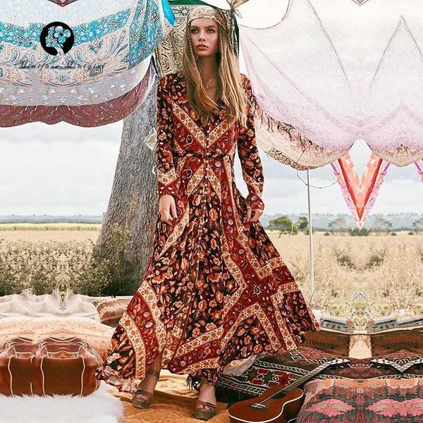Autumn Long Boho Women Dress V Neck Full Sleeve Print High Cut Out