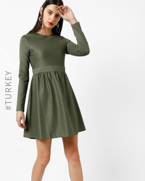 Fit And Fair Olive Green Ribbed Knit Long Sleeve Skater Dress