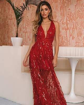 Her Fashion Red Vneck Long Sleeve Maxi Sequins Side Slit Bodycon