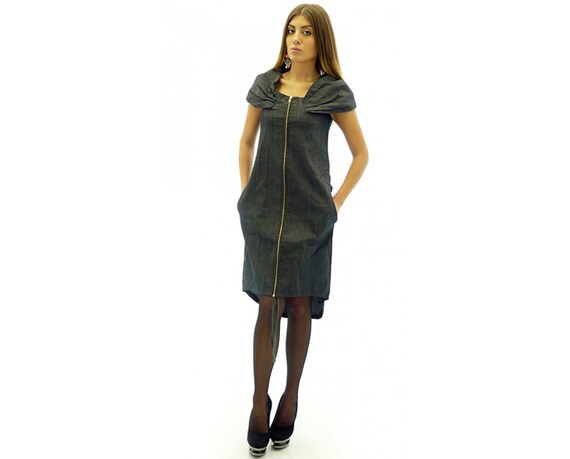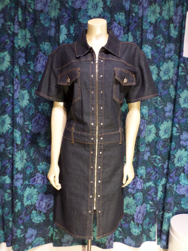 Vintage 90 S Dark Wash Denim Jean Zip Up Dress Plus Size Etsy