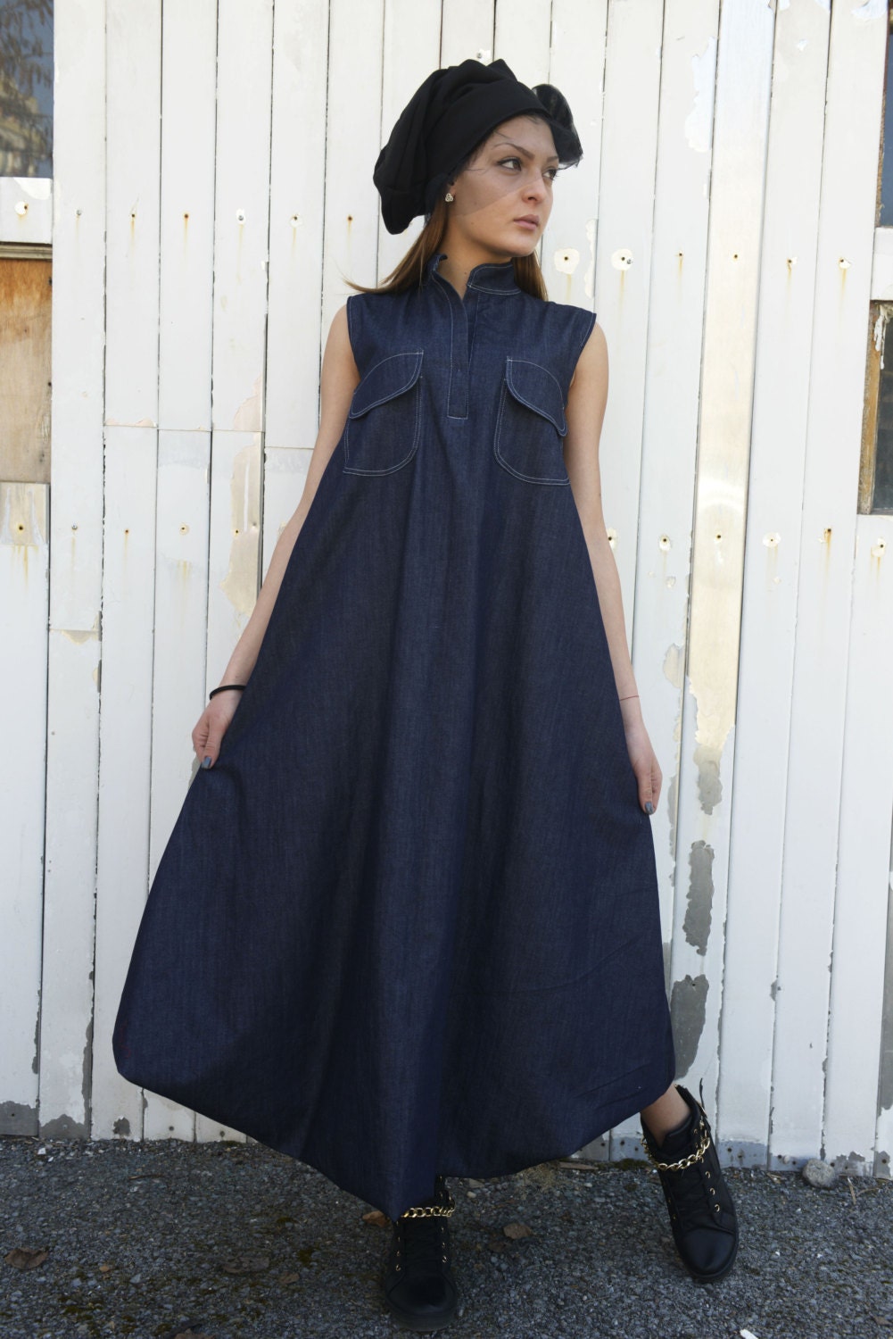 Denim Maxi Dress Blue Jean Dress Dark Blue Kaftan Oversize