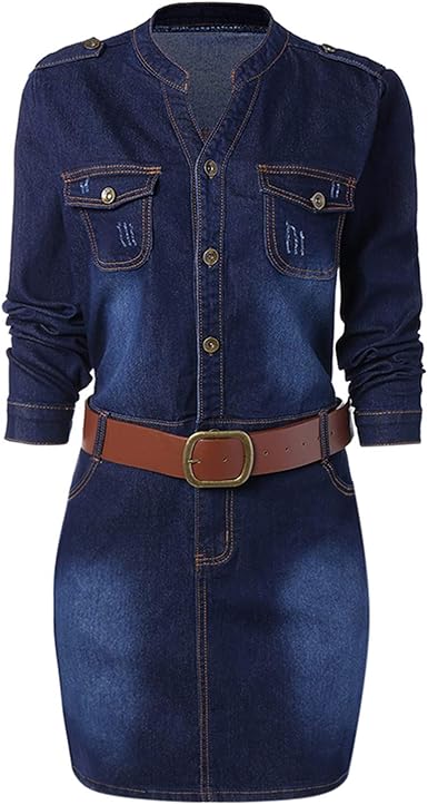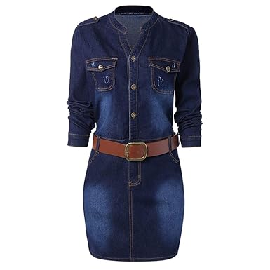 Amazon Com Plus Size Fitted Denim Jean Dress With Belt Clothing