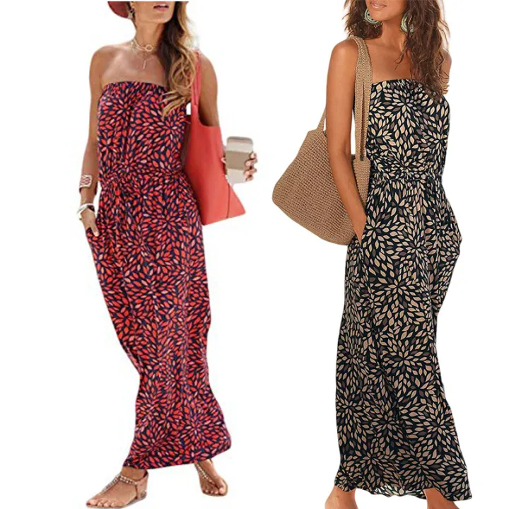 Women Strapleess Floral Print Dress 2020 Summer Bohemian Beach