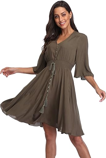 Boho Beach Dress For Women V Neck Long Bell Sleeve Mini