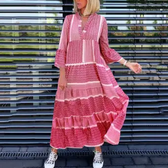 Fashion Women Printed V Neck Long Sleeve Beach Party Dresses