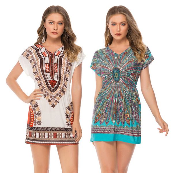 2019 New Summer Bohemian Dress Bohemian Print Dress V Neck Loose