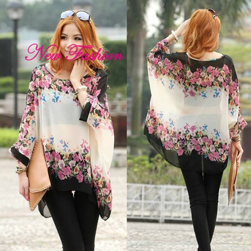 Fashion Women Batwing Sleeve Floral Chiffon Blouse Oversized