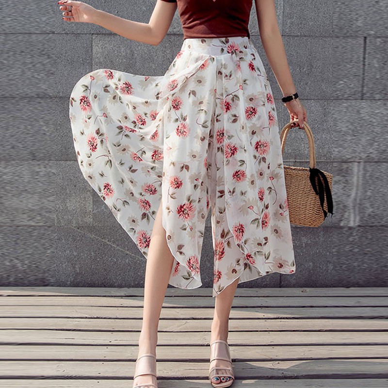 Bohemian Style Floral Printing Beach Pants Women Elegant Chiffon