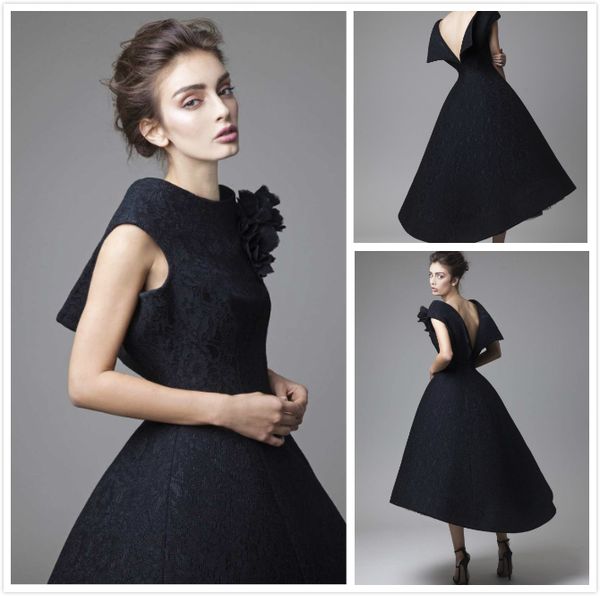 Sexy Black Short Evening Dresses Lace Backless A Line Cap Sleeve