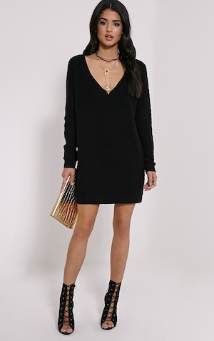 Hatty Black V Neck Jumper Dress Dresses Prettylittlething