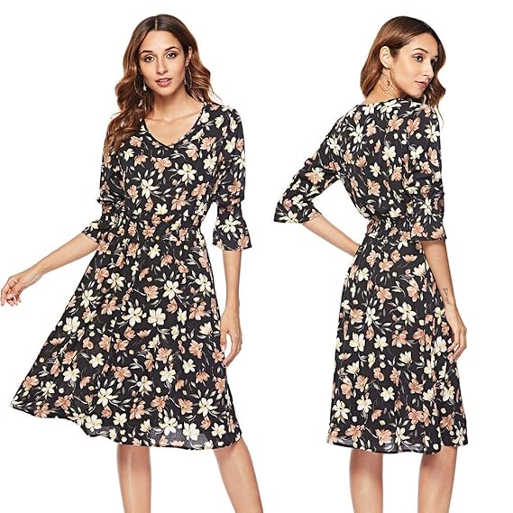 Simple flavor womens floral vintage dress elegant midi evening dress 34 sleeves.