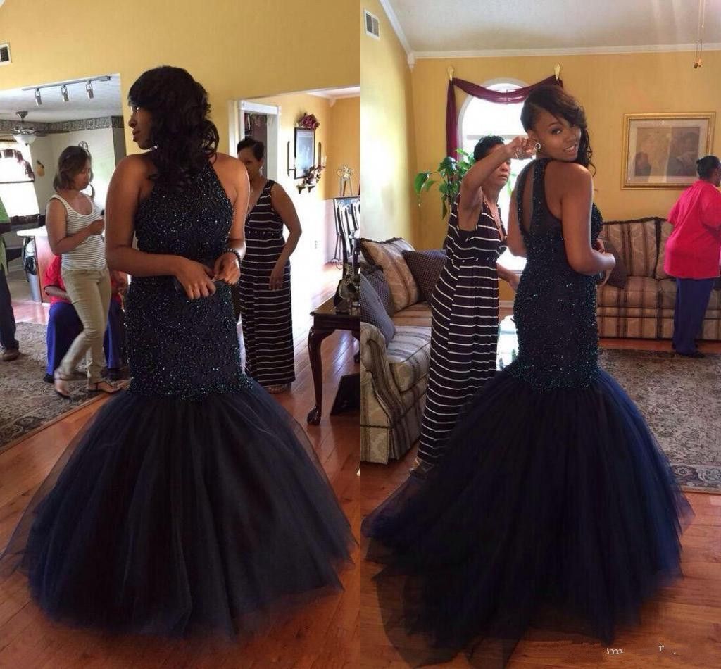 Classy Navy Blue Beaded Mermaid Prom Dresses Tulle Long Sequined