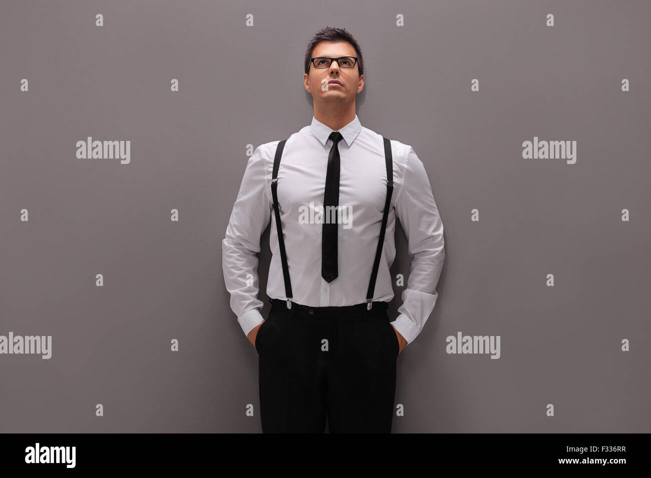 Confident Young Man In Elegant Outfit Leaning Against A Gray Wall