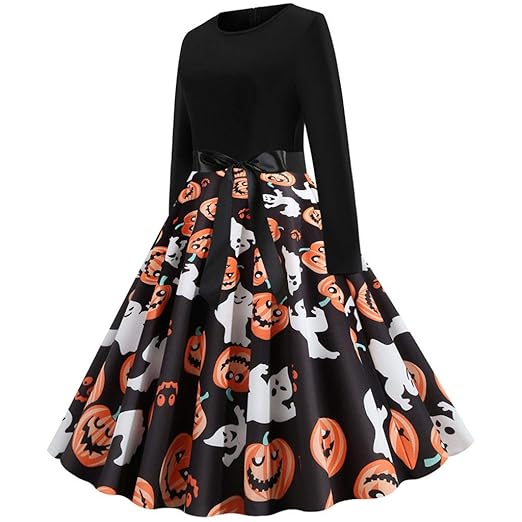 Women Halloween Dress Long Sleeve Pumpkin Floral Print Midi Dress
