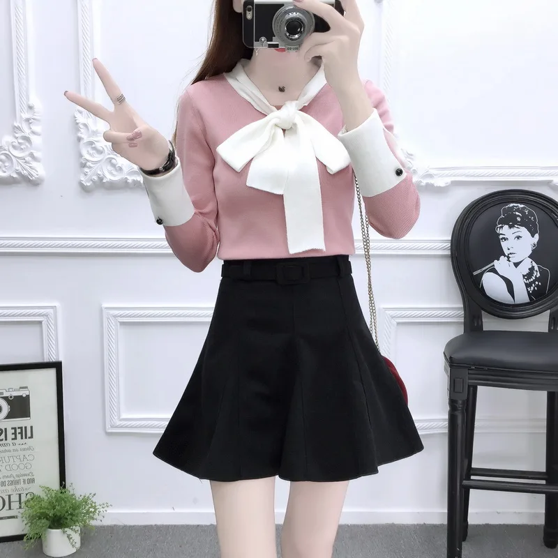 Korean Fashion Suit College Wind Bows Sweater Bust Skirt Of Tall